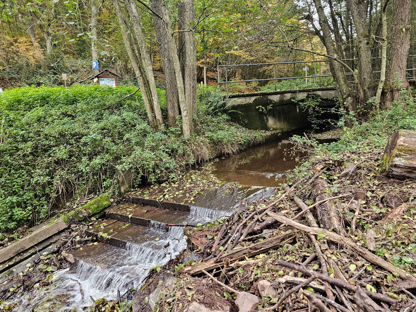 - Verbesserung der Gewässerdurchgängigkeit: Ein zentrales Hindernis, ein zerstörter Beton-Absturz unterhalb der Antetalstraße, wurde vollständig entfernt und durch eine naturnahe, fischgerechte Struktur „Raue Rampe“ (Fischaufstiegsanlage, Sohlrampe) ersetzt. Die etwa 40 Meter lange Sohlgleite mit einer deutlich flacheren Neigung (Verhältnis 1:20) aus Natursteinen verbessert die Fischwanderung am Großbach maßgeblich. Die Verwendung von Naturstein-Blocksteinen und die natürliche Sedimentation sorgen für eine raue Oberflächenstruktur, die Ruhezonen für Fische und andere Wasserorganismen bietet. Die „Raue Rampe“ ermöglicht durch reduzierte Fließgeschwindigkeit des Gewässers den wandernden Fischen den Fischaufstieg zu den oberen Gewässerabschnitten und anderen Wasserorganismen die longitudinale Durchgängigkeit des Bachlaufs.